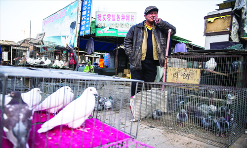 A vendor and his pigeons in Beijing's largest pigeon market in Caihuying Xijie, Fengtai district Photo: Li Hao/GT