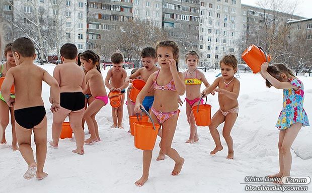Despite the freezing temperatures in the city of Barnaul, a group of kindergarten children pour freezing water on themselves as part of their daily exercises.